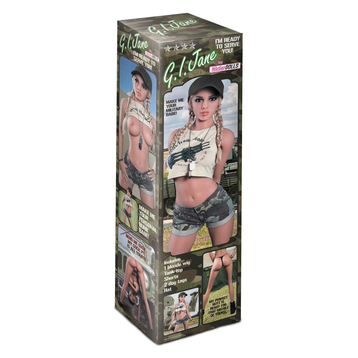 en Hut! GI Janes new tour of duty is straight to your bedroom and shes ready to take orders from her new commanding officer. Made with premium materials and a sturdy skeleton that makes it easy to pose your sexy little grunt the way you want even standing her up on her own for your enjoyment! This sexy veteran boasts a hard earned body - tight curvy and plush to fulfill your every desire.GI Jane features a durable skeleteon making her fully posable from her toes to her eyelids - bend her over for her daily drill or have her salute your flagpole when you return home for some service! Dress her up in the included tank top shorts and hat to complete her military uniform. The included braided blond wig fits her army aesthetic perfectly and you can even slip on some size 7 boots to complete her outfit!Indulge in her textured vaginal anal and mouth holes until you bust! Compatible with water based lubricants only. Warm up her holes with plenty of water based lube to get her vag ass or mouth wet and ready for your enjoyment! Adorn her neck with the included dog tags and hear them ring and jingle with every thrust into this submissive soldier.Pinch her nipples and watch her breasts bounce as you pound this GI into obediance! GI Jane is ready to serve her new master - order her on her knees for some basic training or keep her upright at attention until the mood strikes. Body Measurements:Height 65 inches / 166 cmShoulder width 13 inches / 33 cmArm circumference 9 inches / 23 cmBreast 31 inches / 79 cmUnder bust 23 inches / 59 cmWaist 21 inches / 54 cmHips 32 inches / 82 cmWrist 6 inches / 14 cmThigh circumference 18 inches / 45 cmCalf circumference 11 inches / 29 cmCrotch to ground 33 inches / 85 cmNeckline to ground 61 inches / 154 cmHole Measurements:Vaginal depth 7 inches / 18 cmAnal depth 7 inches / 18 cmOral depth 6 inches / 15 cmNote: Weighs 71 lbs shoe size US 7/ EU 37.5